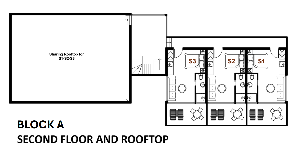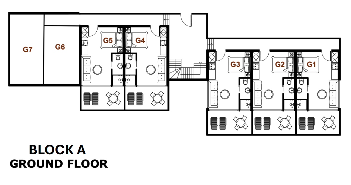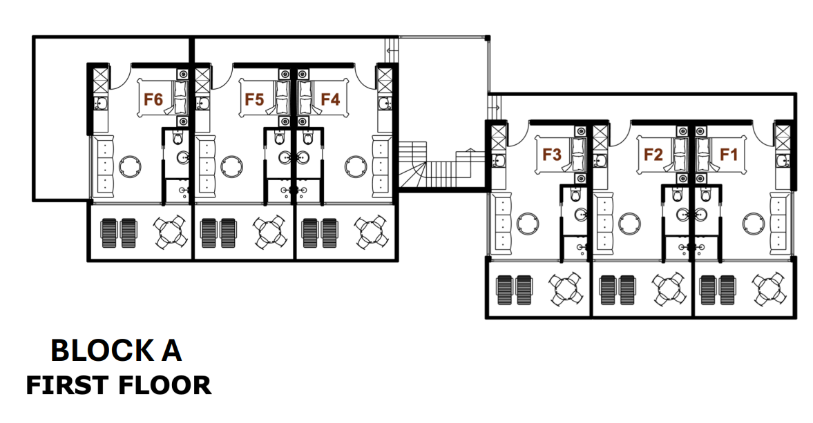 Το πρώτο κτήριο περιλαμβάνει 15 διαμερίσματα — 6 ισογείου, 6 πρώτου και 3 δευτέρου ορόφου.