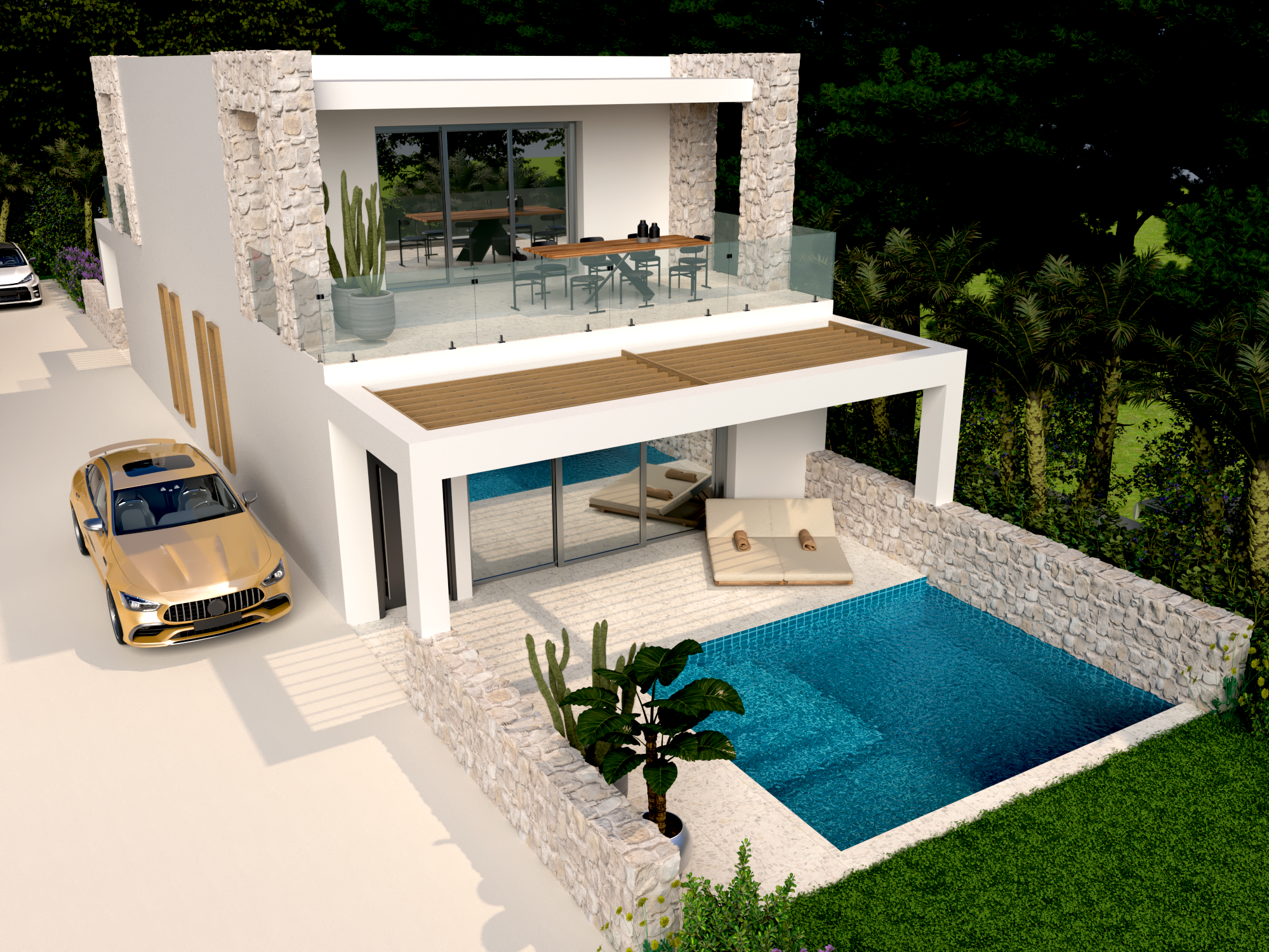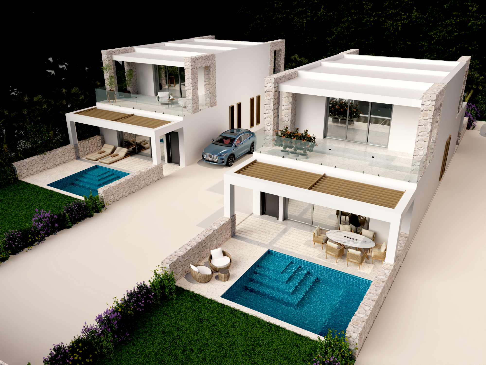 Villa located within a complex of six luxury villas, designed for comfort and functionality. It features a covered area of 120 sqm and a livable area of 80 sqm, characterized by contemporary Mediterranean architecture with expansive windows that enhance natural light and views.